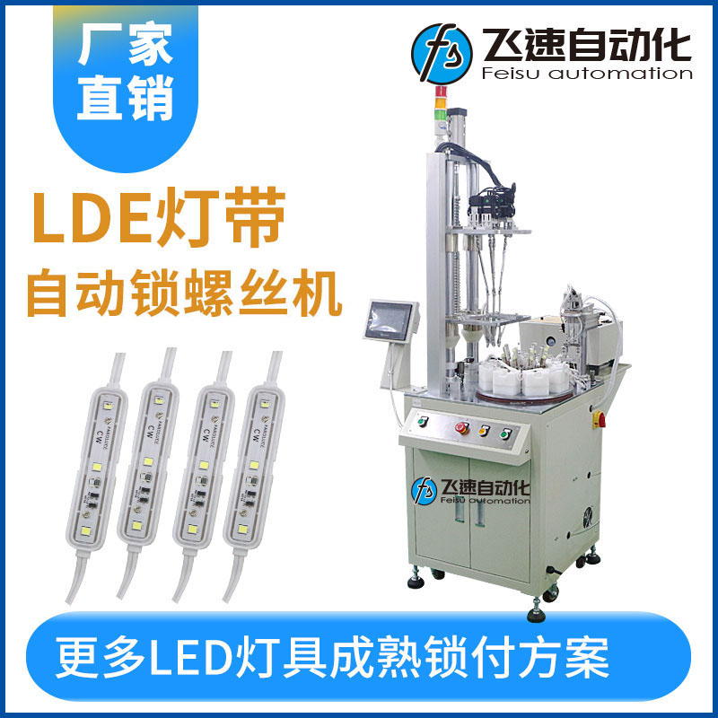 led燈帶是指把LED組裝在帶狀的柔性線路板或PCB硬板上,產(chǎn)品形狀象一條帶子又非常節(jié)能和綠色環(huán)保,用于各個行業(yè)中的裝飾,LED燈帶的使用也越來越普及,也因為使用壽命長(一般正常壽命在8~10萬小時),所以在市場上需求也比較大。 LED燈帶是采用FPC做組裝線路板,生產(chǎn)組裝過程中都需要對燈具貼片和各個工件進(jìn)行螺絲緊鎖加工,在傳統(tǒng)的生產(chǎn)線上,技術(shù)工人需要對不同型號的燈具體分別進(jìn)行螺絲鎖緊加工操作,雖然也應(yīng)用了自動機器人之類的自動設(shè)備,但是傳統(tǒng)生產(chǎn)線的自動化水平還比較低,不能適用于不同型號的燈具加工,設(shè)備的自動化水平還需提高。 本案例應(yīng)用于LED燈帶自動化生產(chǎn)線的自動鎖螺絲機,主要目的在于解決生產(chǎn)中的不足和缺點,設(shè)計一臺自動化燈具生產(chǎn)螺絲設(shè)備,它不僅可以對燈具進(jìn)行自動化地組裝、鎖緊加工操作,而且可以適用于不同型號、規(guī)格、大小的燈具體,設(shè)備的自動化水平比較高。 該設(shè)備根據(jù)產(chǎn)品進(jìn)行設(shè)計多工位轉(zhuǎn)盤式螺絲機,通過在轉(zhuǎn)盤式安放多個工位實現(xiàn)多工序同步作業(yè),主要是為了實現(xiàn)擰螺絲和取放產(chǎn)品同步完成,作業(yè)員不停放置產(chǎn)品,設(shè)備不停擰螺絲,增強了人機協(xié)作,較大幅度提升效率,減輕人工勞動強度。
