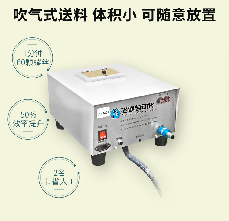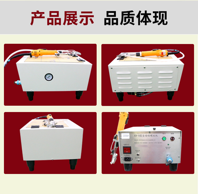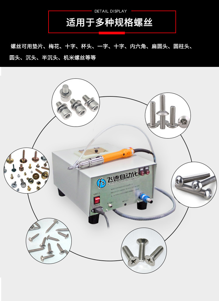 - 產(chǎn)品簡介: 手持式自動打螺絲機也叫自動供料鎖螺絲機、自動擰螺絲機等,嚴格來講,手持式只能算是半自動,因為它還是需要手工操作。一臺手持式自動鎖螺絲機主要由兩部分組成:自動供料機和電批,其中自動供料機是重要的,也是復(fù)雜的,它的好壞直接關(guān)系到機器卡不卡料的問題。1.采用渦輪上料,體積和噪音小、重量輕,可存放在工作平臺上,節(jié)省空間; 飛速手持式螺絲機: 1.螺絲自動排列、供料,自動篩選異型螺絲,自動補給空料,無料會自動報警; 2.送料采用感應(yīng)器控制,鎖付完一顆來一顆,自動送料,不會出現(xiàn)重復(fù)給料現(xiàn)象; 3.滑牙不送料:在鎖付工程中,扭力達不到,螺絲不送出,防止批嘴出現(xiàn)卡料現(xiàn)象; 4.穩(wěn)定性好,不卡料,即使不良導(dǎo)致卡料,非專業(yè)人員也可以在幾秒鐘內(nèi)解決卡料; 5.效率高,一般1秒鐘打一個螺絲,不用抓起螺絲,只需對準螺絲孔位鎖緊螺絲即可; 6.可減少1到2個工人螺絲鎖付作業(yè),實現(xiàn)半自動化生產(chǎn),降低工人的勞動強度,提高生產(chǎn)率; 7.關(guān)鍵部位采用高品質(zhì)五金材料并經(jīng)過特殊處理,電子原器件采用原裝進口,確保設(shè)備零故障。 產(chǎn)品適用范圍 1.適用于各種類型的螺絲,螺絲總長應(yīng)大于1.3倍螺帽直徑; 2.支持深孔螺絲鎖付,孔深小于40mm,M1-M6的螺絲; 3.適用于數(shù)碼、電子、小家電、電源開關(guān)、燈具、LED、玩具等產(chǎn)品。